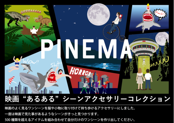 映画のよく見るワンシーンを服や小物に取り付けて歩けるアクセサリーにしました。